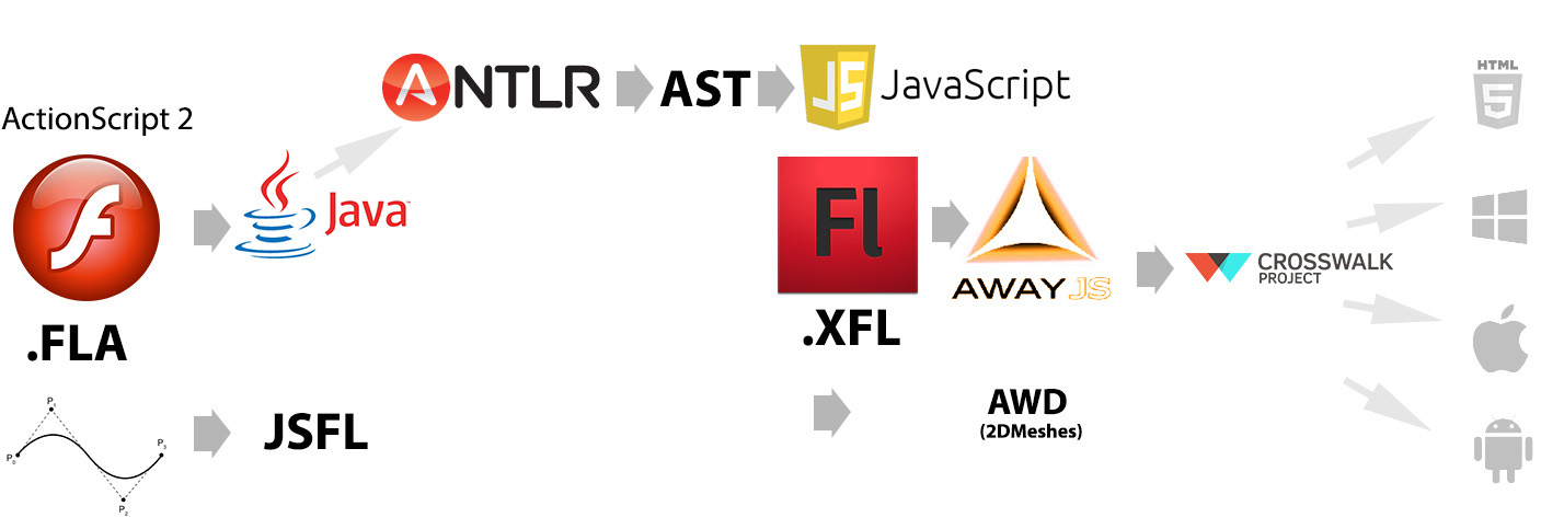 Конвертер был лишь частью большего проекта по портированию популярной игры icycle на кроссплатформенную технологию crosswalk. Я присоединился к проекту немного позже и перенял эстафету по разработке непосредственно AS2-to-JS траспилера. Конвертер (Транспилер) написанный Java, при помощи технологии ANTLR3 сканирует код во фреймах из .fla файла в Абстрактное Дерево Объектов и преобразует его в JavaScript код, затем конфертирует ActionScript2 Adobe Flash файл в .XFL javascript документ. Затем Flash расширение на основе JSFL кода конвертирует вектор из флеш анимации в AWD меши для дальнейшего импортирования его в AwayJS. В финале приложение проигрывается на кроссплатформенном контейнере Crosswalk и представляет из себя расширение к JavaScript WebGL управляющее GPU анимацией